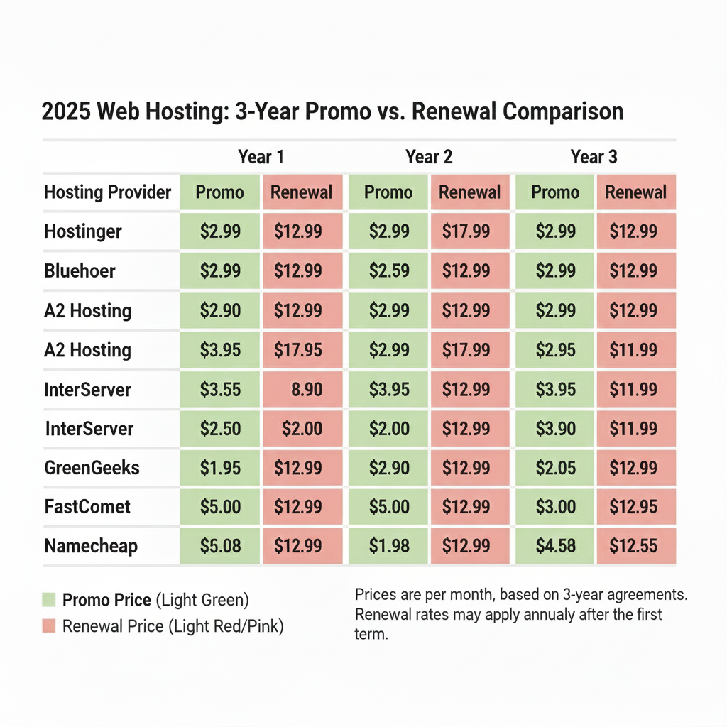 Renewal rates typically double or triple promotional prices—$3 monthly plans might renew at $8-12 monthly. Calculate these costs before initial signup to avoid surprise billing. Some hosts like InterServer maintain consistent pricing without dramatic renewal increases.